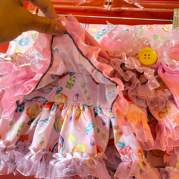 handmade skirt with candy patterned fabric, pink bow on the side with a yellow big button!