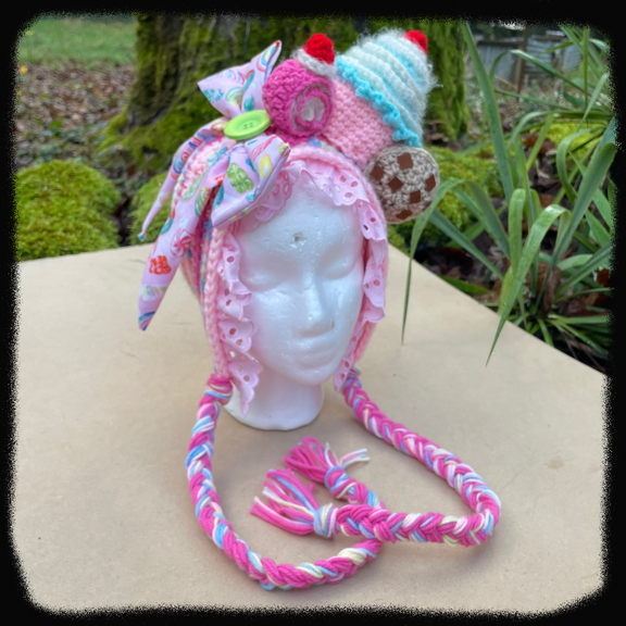 this hat took me hours to design and put together! from crocheting the cupcake, sewing the cookie together, and making the bow perfect. I hope whoever purchases this candy island treasure falls in love with it again and again. as always this hat was made with so much love.