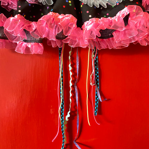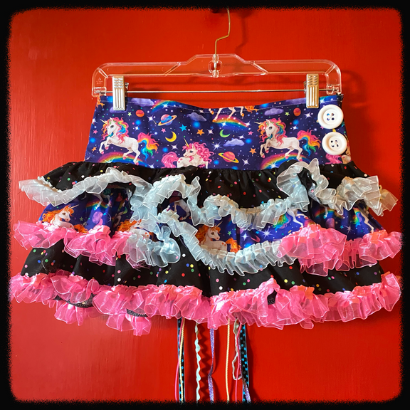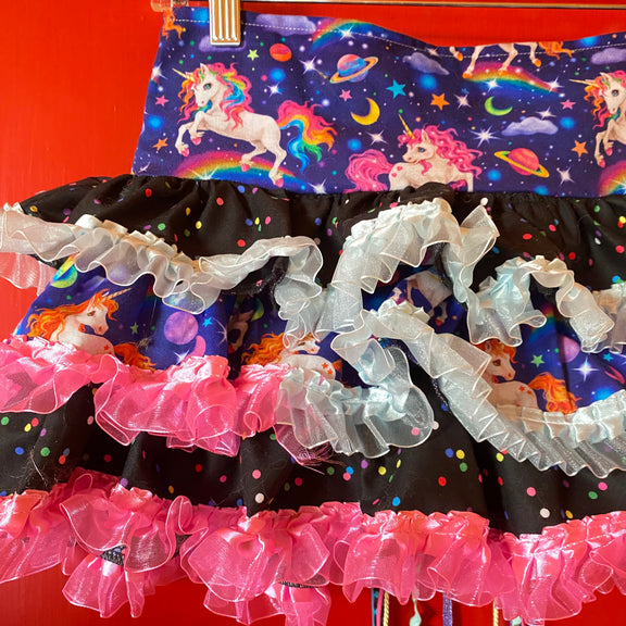 our unicornlandia skirt! made with unicorn patterned fabric, buttons, and a big handmade bow with long lace coming down it! one of a kind layered skirt!